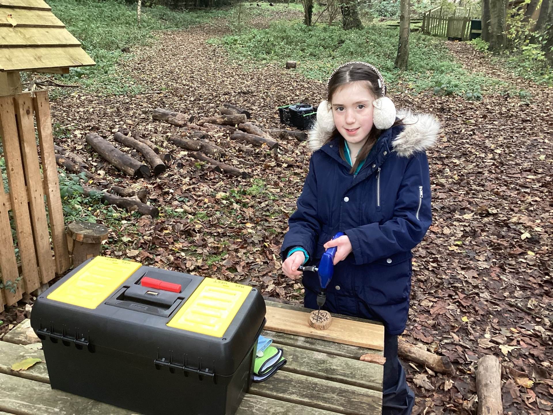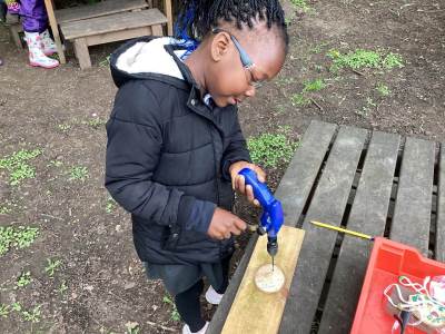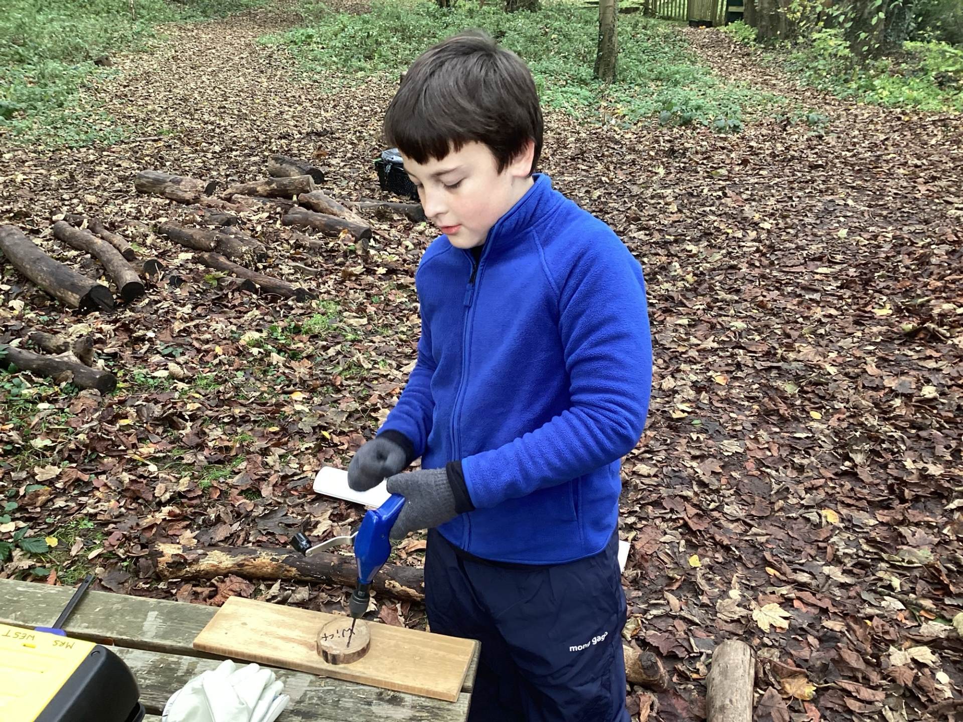 Forest School Session 3 - 8.10.25 - Today in Forest School we have used a new tool- the hand drill! We have drilled holes in our wooden discs so that we can attach some twine to hang them from our school Christmas tree at the festival in December.