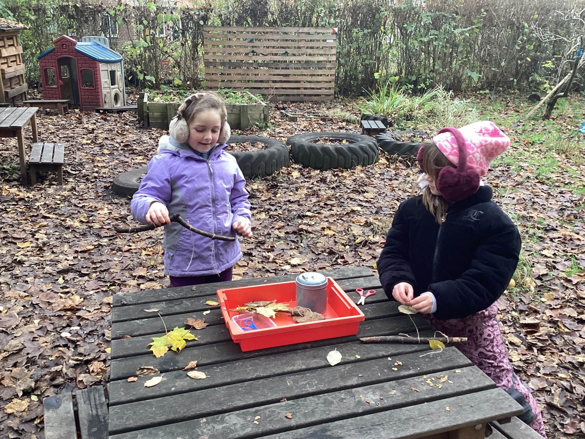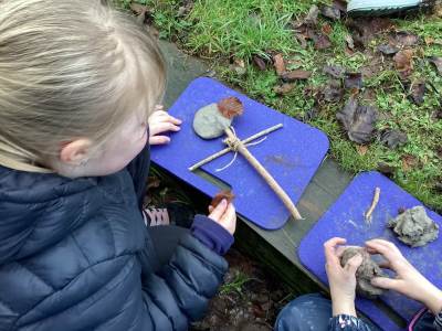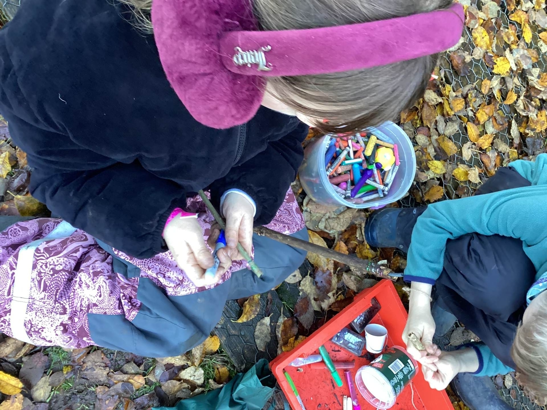 Forest School Session 4 - 22.10.2025 - We had a super final Forest School session today. We used natural materials to make a lean-to shelter, using a horizontal elder branch as a support. Some of us enjoyed using cut stems from the elder to create pencils- we used tent pegs to push the soft pith inside the stems and then found some charcoal to fit in the gap. We then decorated our pencils.