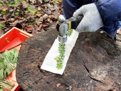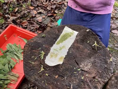 - To celebrate the Year of Reading, we started a project to make bookmarks using the Japanese Hapa-zome 'flower pounding' art technique. We used hardy winter herbs (sage, rosemary and mint). We will carry on with this project in our next sessions.