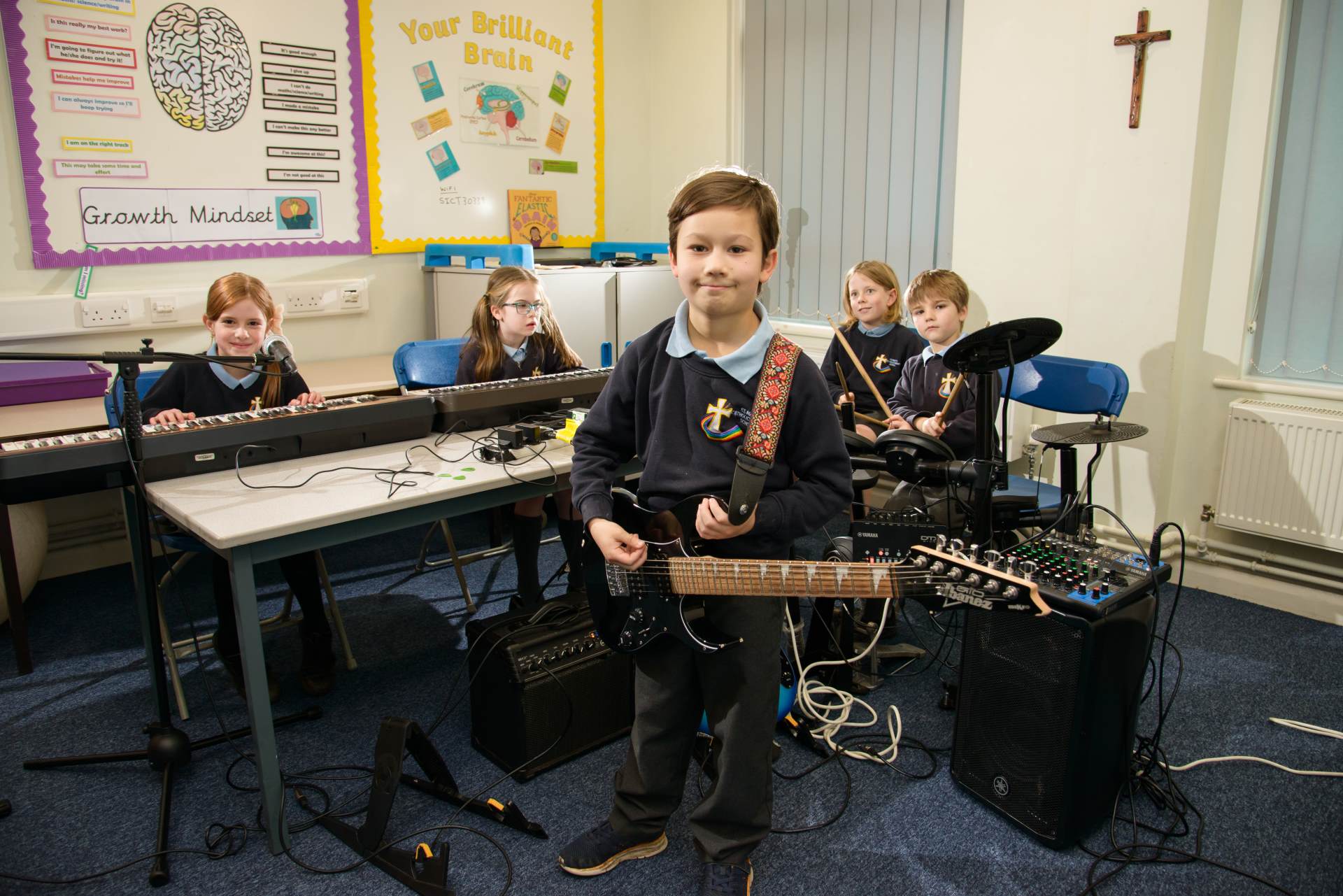 We are proud to be part of the Diocese of Leeds School Singing Programme. Classes 4 and 5 receive weekly singing sessions delivered by an expert Choral Director from the Diocese, focusing on positive engagement with singing and supporting the Catholic life of the school through sacred music. The sessions offer practical and incremental coverage of areas of the music curriculum - including notation - in a two-year curriculum framework developed by the Diocese, the National Schools Singing Programme and the National Youth Choir of Scotland.